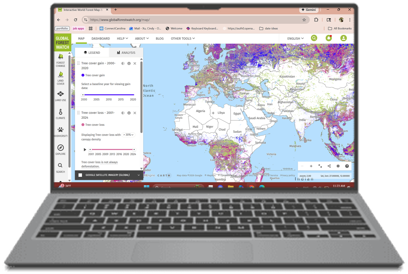 We selected GFW due to its extensive features and functions. It is a highly data-intensive platform with large datasets on a global, country, and regional scale on a wide variety of data relating to forestry. Despite its complexity, GFW’s interface still remains relatively clean and appears well designed to support broad usability. It allows users to explore and analyze real-world data without requiring specialized expertise, login credentials, or actions that could have unintended consequences.