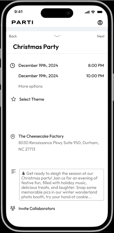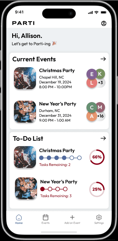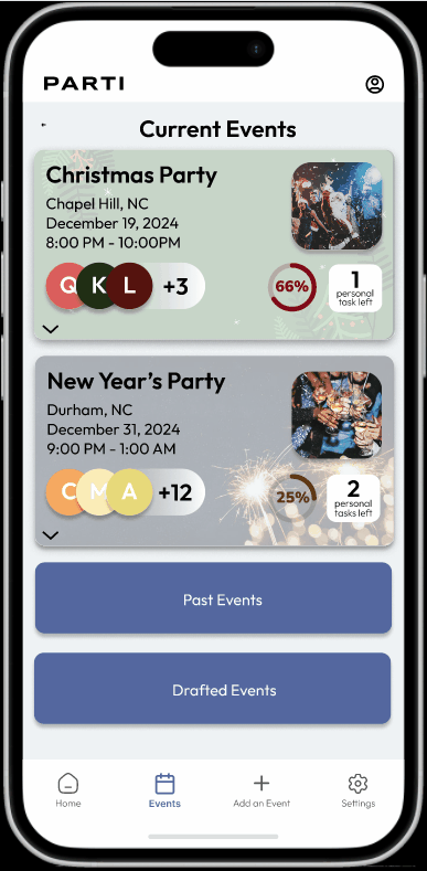 Over the course of a semester-long design thinking project, my team and I developed Parti, a conceptual mobile app designed to empower amateur event planners to organize gatherings with confidence and creativity. My team and I were tasked with identifying pain points with a given task, in which we chose event planning, and iterate through the design-thinking process in order to develop a prototype to address the identified pain points. We chose to focus on amateur event planning, in which users did not have formal tools to plan event suchs as family Thanksgiving dinner, club meetings, and after-work outings. The project followed the full design thinking process — from empathizing with users to prototyping and iterating on feedback — to create a tool that simplifies complex planning tasks while supporting collaboration and personalization.