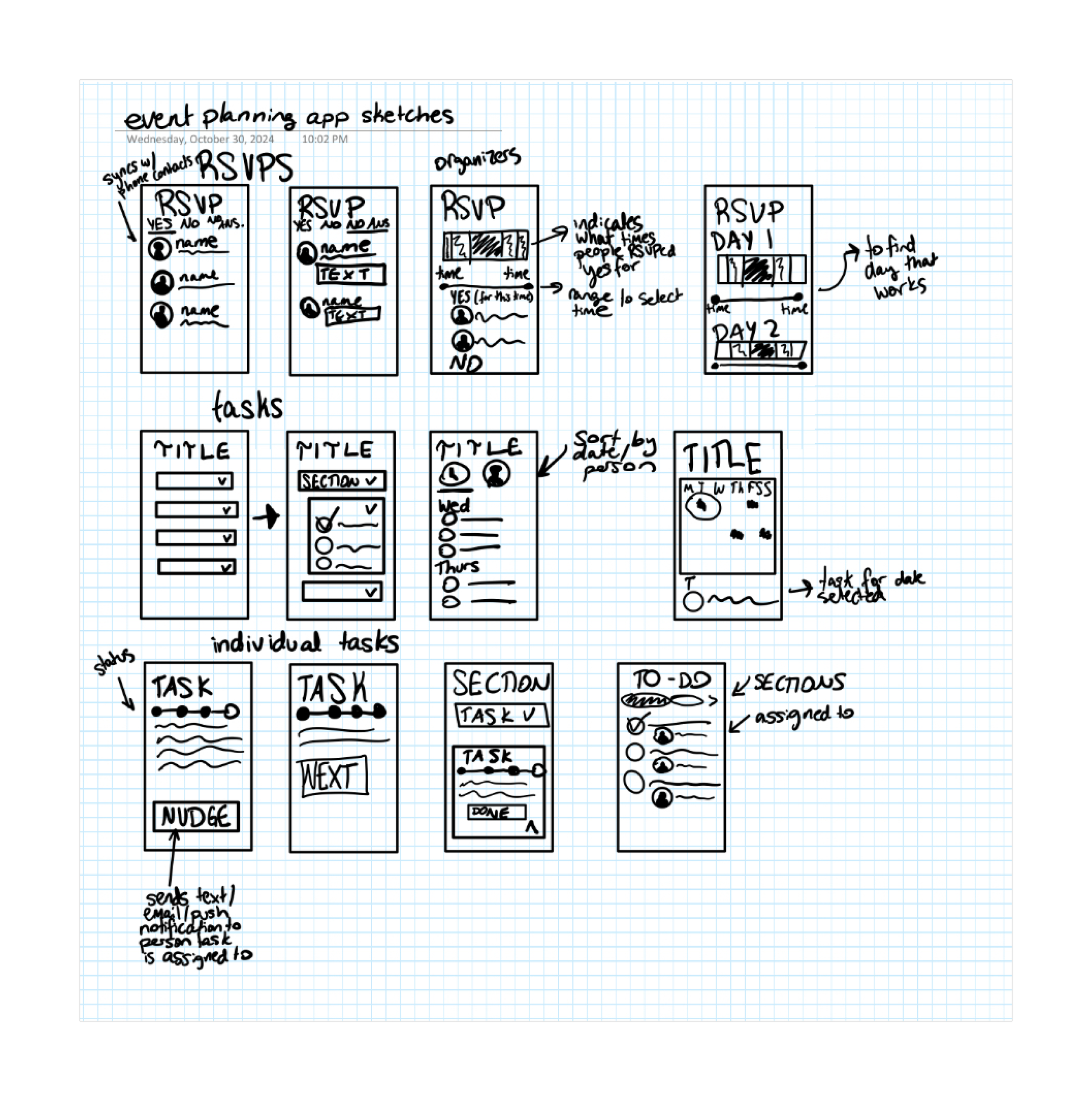 We began by conducting user interviews to understand the common challenges and pain points faced by informal planners, such as planning transportation, coordinating with vendors, and tracking task completion and deadlines. These insights guided our design approach and helped us prioritize features that would be most valuable to users.