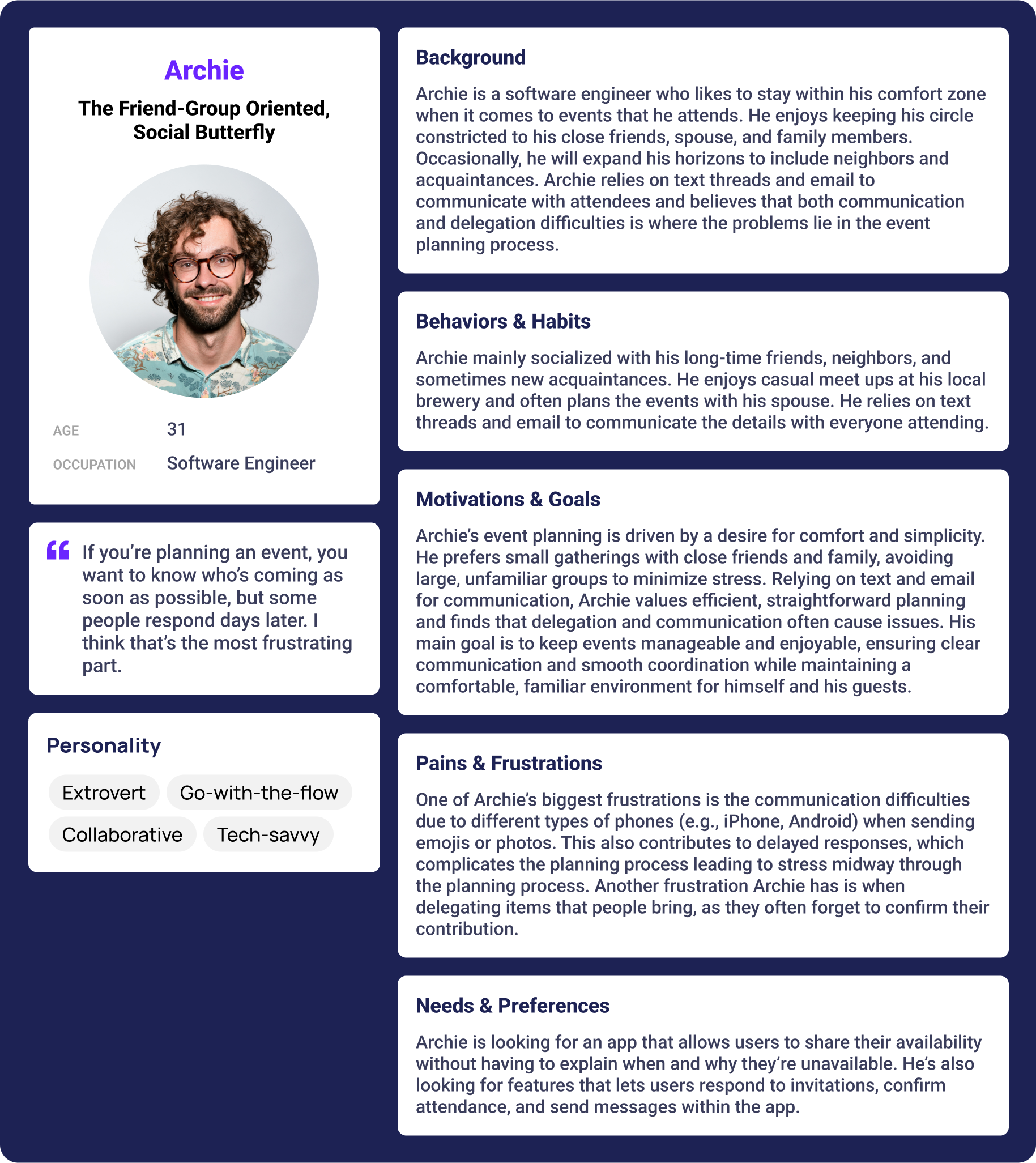 After completeing our interviews, we pulled out key details about our participants such as demographics, event planning needs, and event planning pain points. We seperated our findings into minor pain points, major pain points, and positive findings in order to familiarize ourselves with our participants’ feelings with event planning. After analyzing our findings, we concluded that there was a need for a centralized event planning tool to address our participants’ needs. Our findings led us to revise our original problem statement in order to best represent our participants feelings.