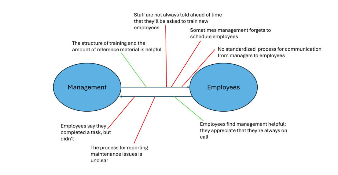 There seemed to be a communication gap between management and employees at PBCH as gathered from the interviews. Staff are not always told when new employees are coming in and requiring training, and sometimes management forgets to schedule employees. Overall, there seemed to not be a standardized or structured process for management to communicate with employees. Processes such as reporting maintenance issues were unclear and employees often falsely reported tasks being completed to management, signaling another large communication gap.