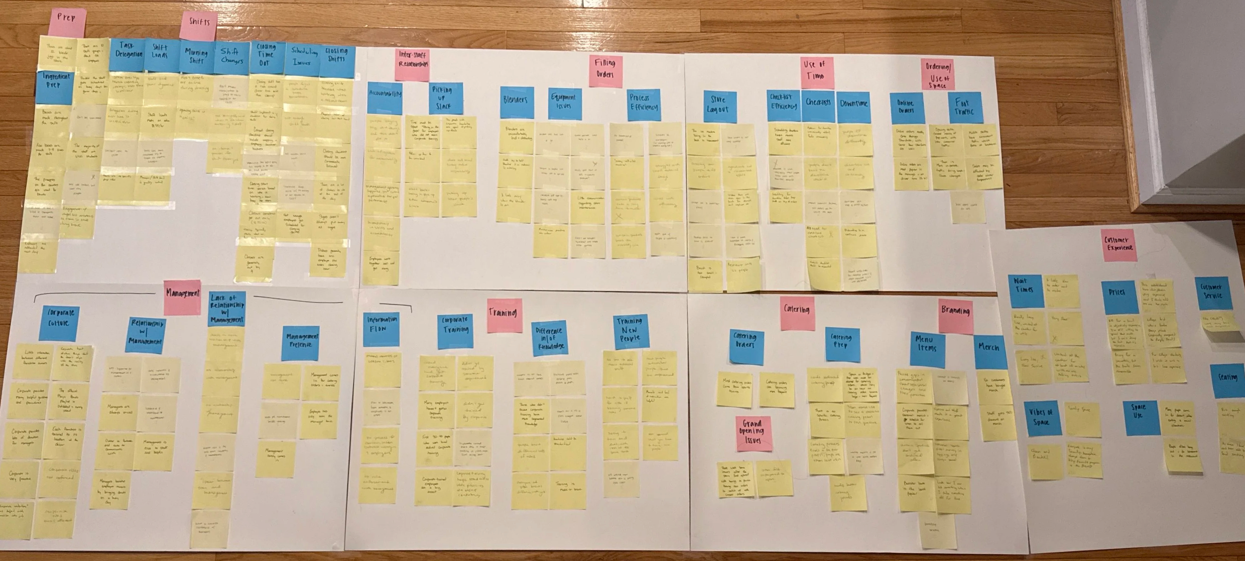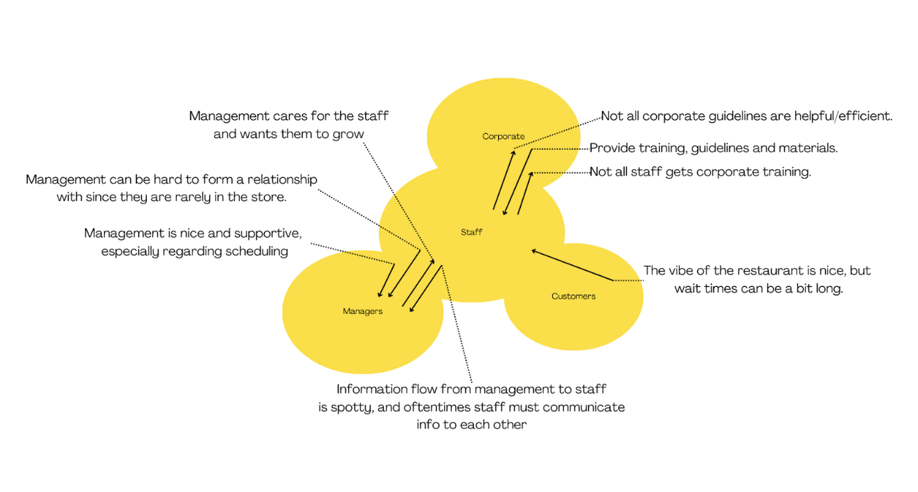 Our original affinity diagramming session took approximately two hours in order to create our identify our initial themes and patterns and organize them into our final affinity diagram. From the affinity model, we were able to identify relationships between the 12 overarching categories and how each category interacted within system. Through this, we were able to see the larger issues that our interviews cited, and develop recommendations for a new system based on the affinity diagram. Specifically, our larger categories in our affinity diagram included Management, Shifts, Training, and Use of Time.