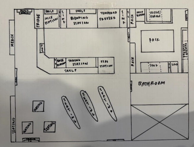 Lastly, our group created a physical model of the workspace and mapped out the different possible workflows that could be happening at any given time at the store. This is because every interview cited some issue with the workspace, whether it be inconvenience of the location of certain items in the store or lack of navigability.